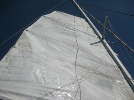見て頂いてお分かりの様に、スクエアーセールですから、セールエリアが非常に広いメインセールです。電動で楽々揚がっていきます。