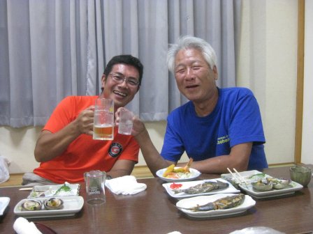 夕方の宴会は民宿「さざなみ」で、刈谷セーリングクラブ会長「ホワイトアロー」のKさんの挨拶の後、私の単なる一声「乾杯」で宴会に突入。