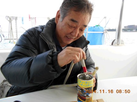 ヨットに着いたら準備万端&液状コーティングゴム(サンケイ工業03-6638-7300)で、ロープのエンドの処理をしてくれてました。![]()