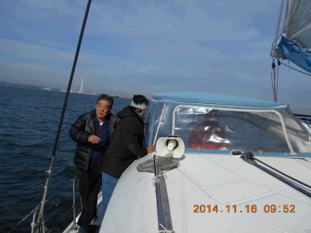 風は少々冷たいが秋晴れの上天気!5人乗ったら即出港&セールアップ。電動ウインチですから楽チンです。