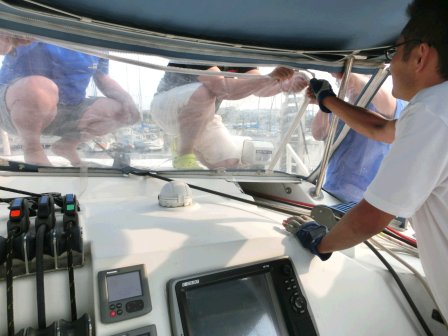 電動ウインチで、メインセールを揚げます。リーフ(縮帆)ロープが干渉したりして、手こずります。じっと見守ります勉強ですから。