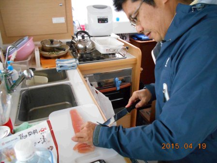 スタートライン近くへ来たら、O君は早速昼飯の手巻き寿司製作に掛かります。