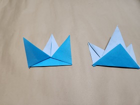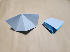 ツバメは羽根が大きく羽ばたくところに特徴があります。片面は鶴の基本折りから花弁折りにして、もう片面は三角に開いて裏側を出すやり方です。
