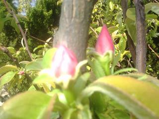 | リンゴの花です。むつです。けっこう大きな実になるのですが、食べられそうになるとカラスがやってきてつついて食べてしまいます。カラス除けをいろいろやってみるのですが、人間よりカラスのほうがいつも利口です。。 |